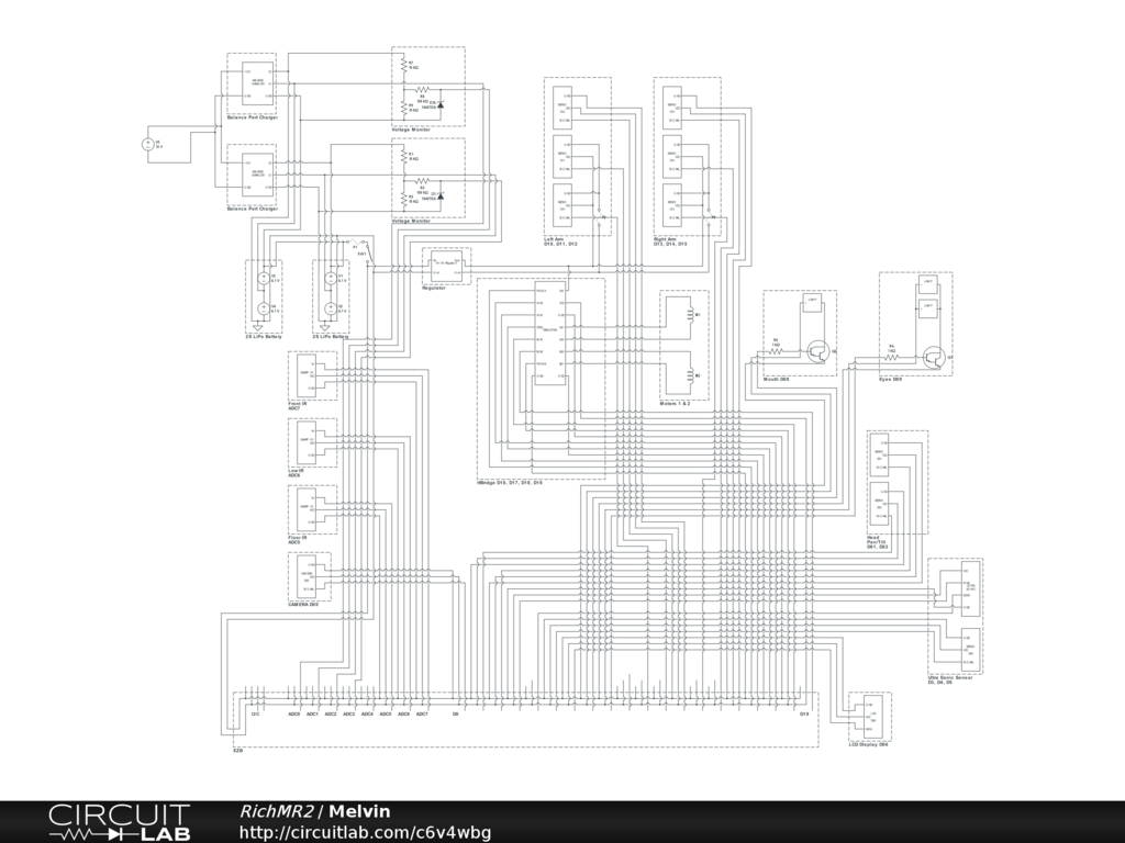 General wiring schematic for the wiring of a Hearoid robot using an EZB Micro Controller from EZ-Robot Inc. Running 3 fixed IR sensors, 1 ultra sonic sensor mounted on servo, H-Bridge controlled drive tran, Darlington Transistor switched LED lamps in eyes and mouth, pan and tilt neck, both arms with 3 servos each for movement and 4 battery monitor circuits to monitor two 2S LiPo batteries.