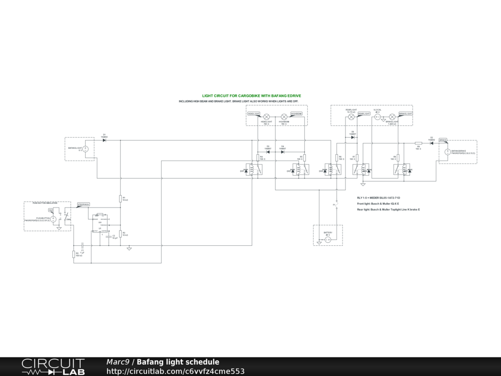 Circuit to control Busch & Muller lights on my cargo bike, which is aided by bafang electrical motor (48VDC). The bafang circuit provides 6 vdc power for lights but is not able to deliver enough power for the lights. I don't want to burn out my bafang circuit, so made a multiple relay circuit. Inially I tried to use only Meder reed relays, which worked on the simulation, but not in reality: the relays got stuck somehow, even after physically removing control voltage. But it seems to work with 4x solid state relays (OPTO 22 DC60MP) and 1 reed relay.