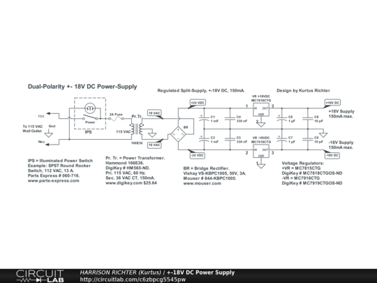Regulated dual-polarity +-18V DC power-supply providing up to 150 mA of current.