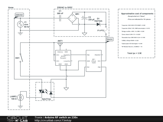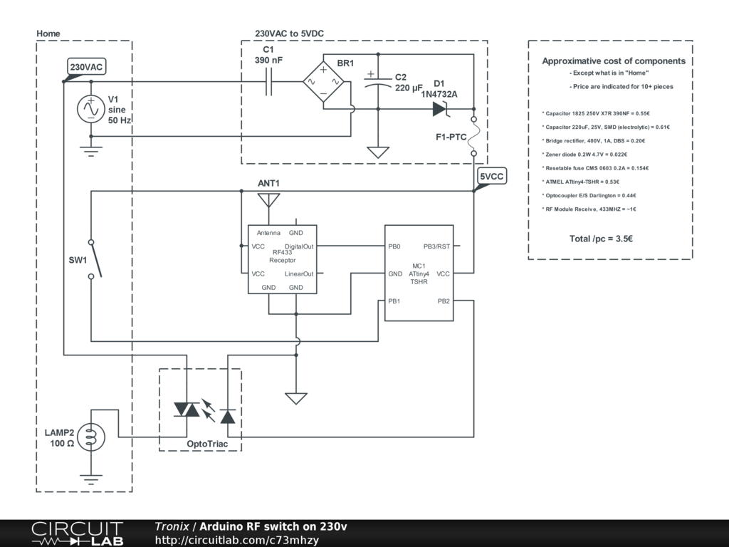 The total cost is aproximately 3.5€ using SMD components and an 1€ RF receiver (price can be lowered to <3€ by doing the receiver from scratch too).