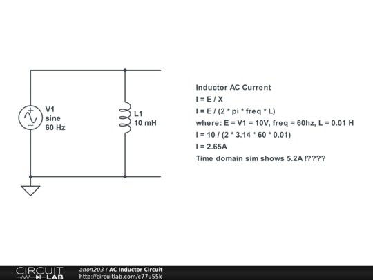 Simple AC series inductor circuit; 60hz, 10V source across 10mH inductor. Inductive reactance equation shown in numerous EE textbooks calculates inductor current = 2.65A. However, time domain sim of same circuit shows steady state current to be approx 5.2A.