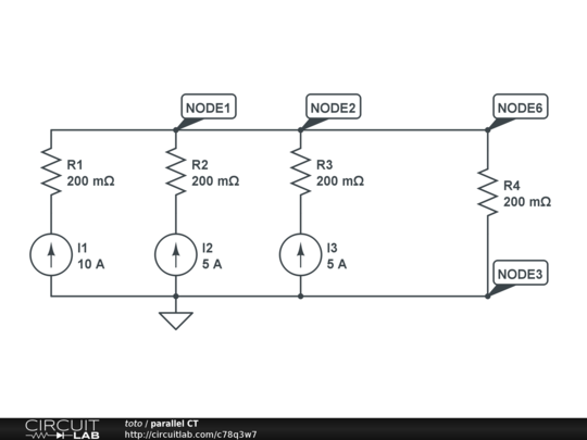 This is to simulate 3 CTs in parallel where 1 CT is operating at 2 x full-load rating (10 amps) while the other 2 CTs are operating at full-load rating (5 amps). This simulation shows that each CT shares the common burden by a factor in direct proportion to the ratio of individual CT current divided by the overall current at the common node, that is, CT1/(CT1 + CT2 + CT3). |