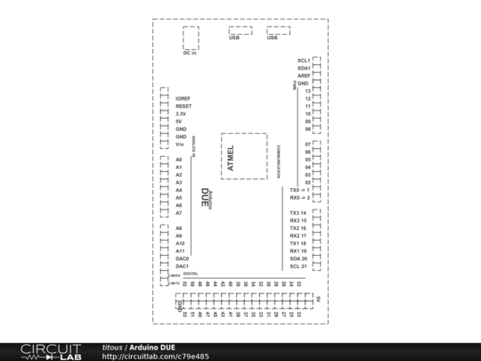 A detailed layout of the new Arduino Uno made entirely of box pieces; includes all pins as well as both USB ports and DC input jack.