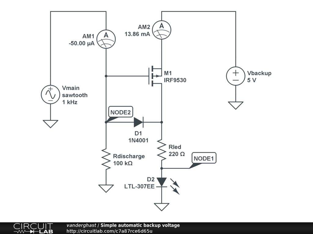 The backup gets on if its voltage exceed Vmain + VGS(TH) of the PMOS. Rdischarge is a pull dow resistor. Rled and D2 simulate the "load" on the circuit. This circuit is just a simple implementation. Note that there is a small ripple occuring with the switching on. Vmain is defined as a sawtooth to simulate a failure of a main DC source.