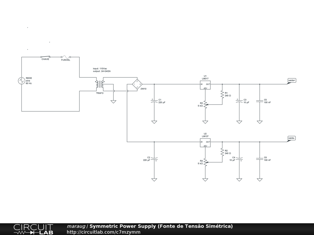 Fonte de tensão simétrica com saídas ajustáveis.