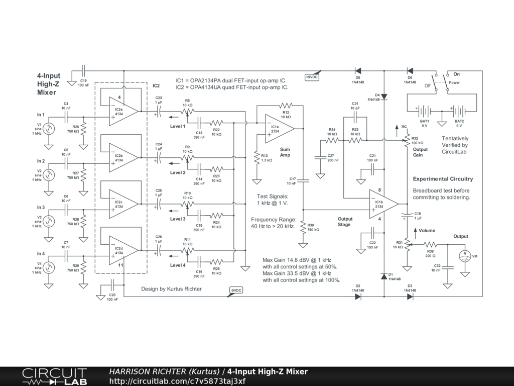 4-input 1-output high-impedance mixer for guitar. Controls Include: Levels 1 through 4, Output Gain, and Volume. Inputs will accept signals from passive or active guitars, effects, effects chains, guitar preamps, or guitar processors. Recommended for 6/7-string guitar (not suitable for 8-string guitar or bass-guitars). General frequency range per input: 62 Hz to 10 kHz. Maximum gain = +2.8 dBV @ 630 Hz per input with all controls at 50% and using a 1V 1kHz input signal. Maximum gain = +21.5 dBV @ 1 kHz per input with all controls at 100%. Note: Circuit gain is proportional to the number of inputs used. Maximum gain = +14.8 dBV @ 1 kHz with all inputs given a 1V 1kHz signal and all controls at 50%, or +33.5 dBV with all controls at 100%. Do not use with all controls at 100% except as a worst-case test while breadboarding. The circuit can be the basis of a stomp-box or rack-mount project. The batteries can be replaced by a regulated dual-polarity +-9V DC power-supply providing >= 30 mA of current. Output phase is inverted compared to input phase. To make in-phase, install an extra capacitor in the signal path at the output.