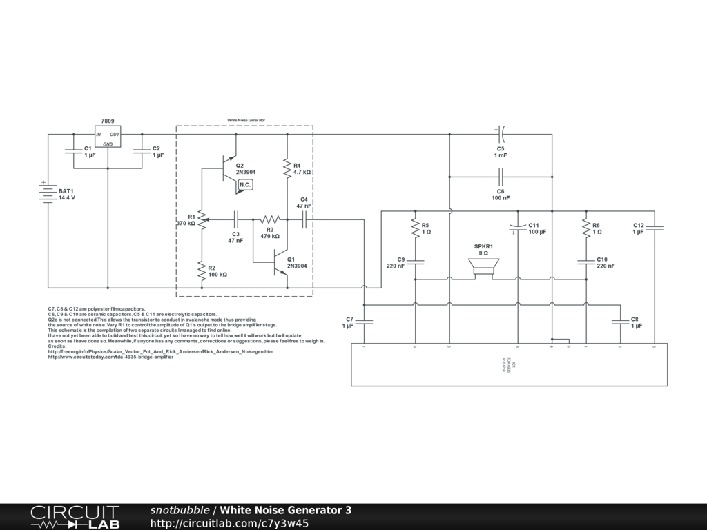 This schematic is the compilation of two separate circuits I managed to find online. I have not yet been able to build and test this circuit yet so I have no way to tell how well it will work. I will update as soon as I have done so. Meanwhile, if anyone has any comments, corrections or suggestions, please feel free to weigh in. Credits: http://freenrg.info/Physics/Scalar_Vector_Pot_And_Rick_Andersen/Rick_Andersen_Noisegen.htm http://www.circuitstoday.com/tda-4935-bridge-amplifier