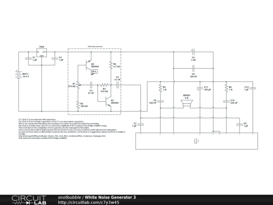 C7, C8 & C12 are polyester film capacitors. C6, C9 & C10 are ceramic capacitors. C5 & C11 are electrolytic capacitors. Q2c is not connected.This allows the transistor to conduct in avalanche mode thus providing the source of white noise. Vary R1 to control the amplitude of Q1's output to the bridge amplifier stage.