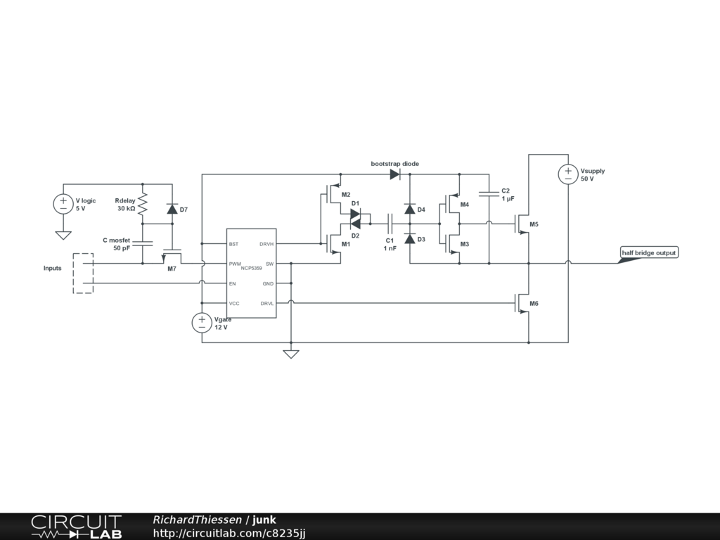 Yet another half bridge driver. Gets around the NCP5359's voltage limitations by using a separate high side driver.