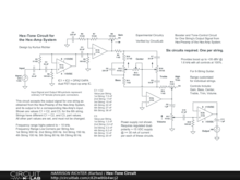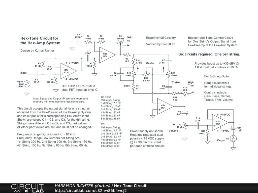 Hex-Tone circuit for Hex-Preamp proposal or Hex-Amp System proposal. Accepts the individual string signal outputs from a Hex-Preamp. One circuit shown. Six required, identical except for capacitors C1 = C2, and C3, in the Input Stage, which are customized for each string. The capacitor values and corresponding frequencies are given in the diagram. Controls Include: Gain, Bass, Center (of Midrange band), Treble, High Trim, and Volume. Provides up to +35 dBV boost with all controls at 100%. The power-supply is not shown. Requires a regulated dual-polarity DC supply providing +-15 VDC @ >= 30 mA per circuit (180 mA for all six circuits). Experimental Circuitry! Fully breadboard test before committing to a soldered build. See complete Hex-Amp system under "Amplifiers" heading at https://kurtusrichtersblog.com .
