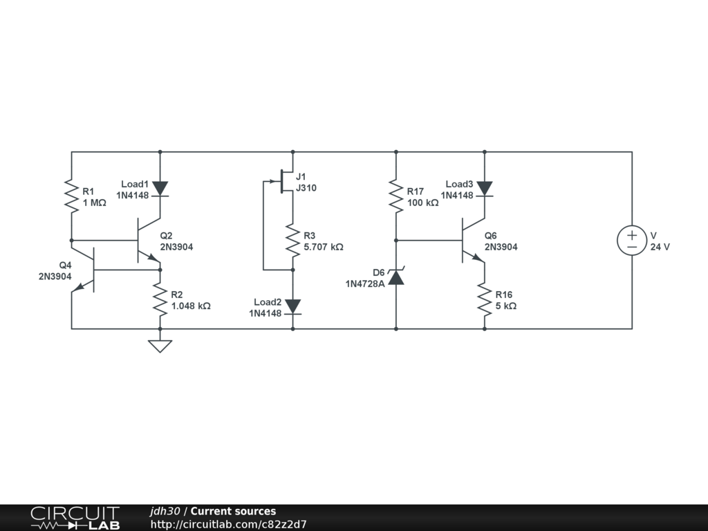 The first (on the far left) is a pair of NPN bipolar function transistors (BJTs) back-to-back so the left one regulates the right one and the Load1 diode has roughly constant current passing through it regardless of the supply voltage. This is the least accurate current source of the three presented here.