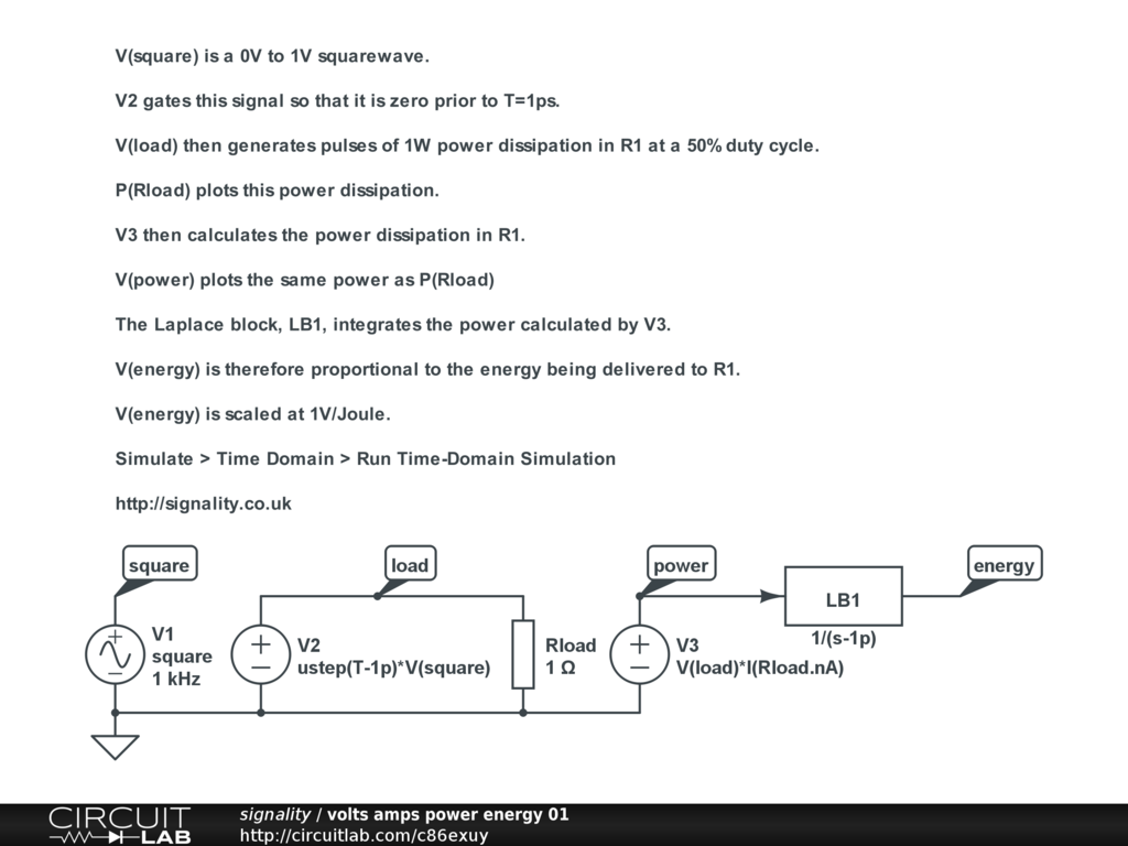 The Laplace block, LB1, integrates the power calculated by V3.