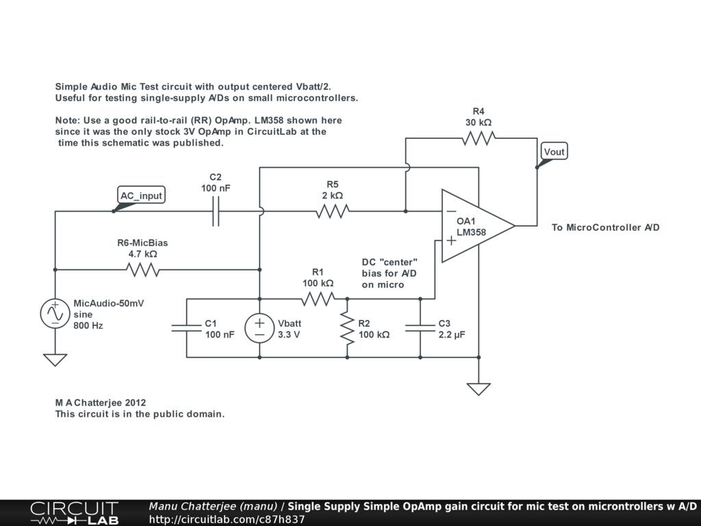 Simple single supply op-amp based gain circuit for microphone to micro-controller interfacing applications. Output is centered around Vsupply / 2.
