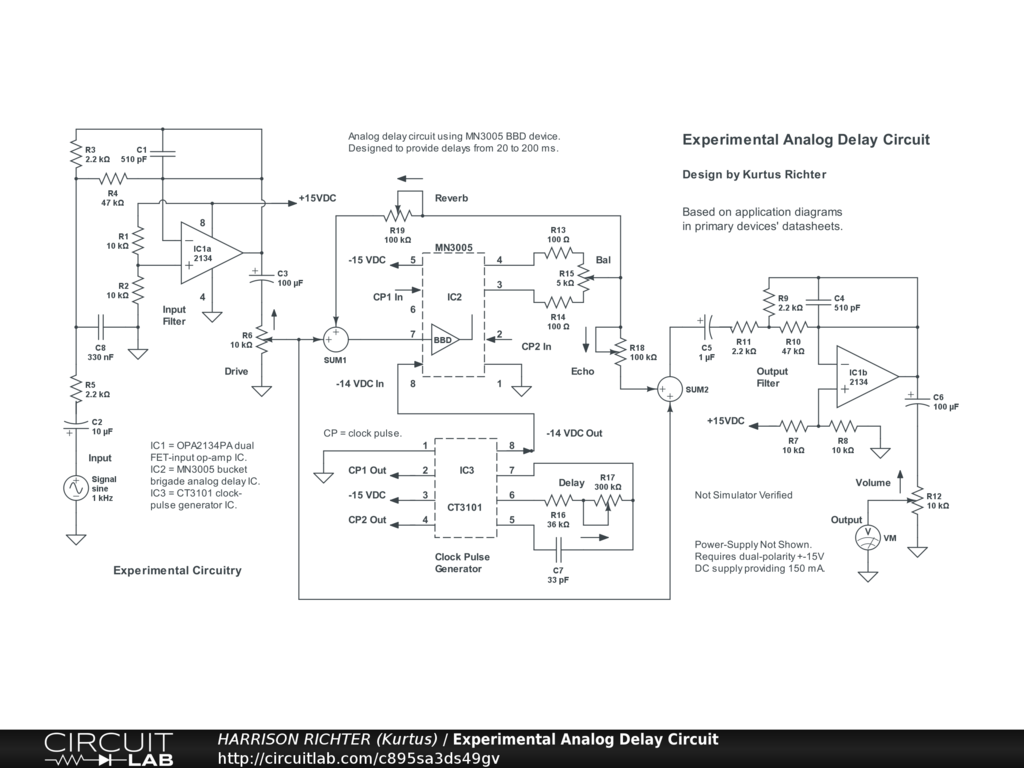 Unverified experimental analog delay circuit for guitar. Controls Include: Drive, Balance, Delay, Reverb, and Volume. Design based on applications information in device datasheets. Not built and tested. Not simulator verified. Power-supply not shown. Requires a regulated dual-polarity +-15V DC supply with up to 150 mA of current. Thoroughly breadboard test before committing to a soldered build.