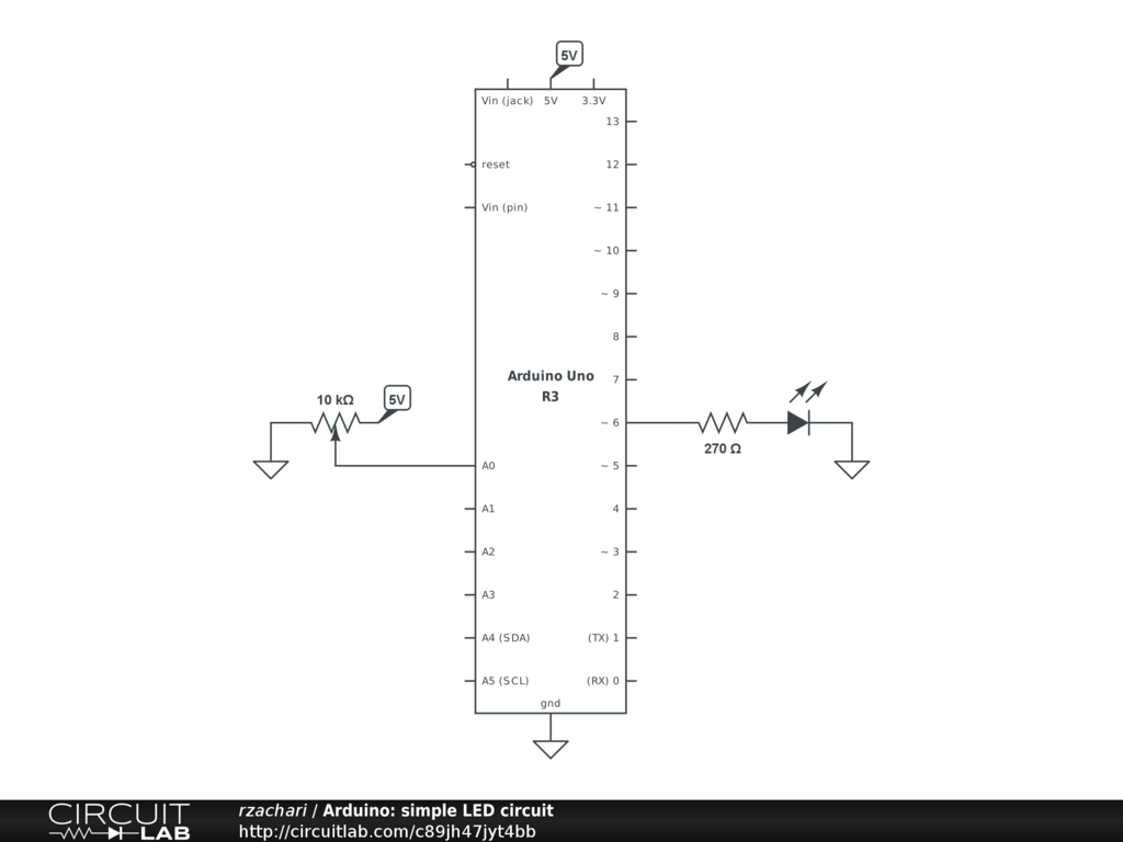 Example circuit with a potentiometer as input and an LED as output to an Arduino Uno.