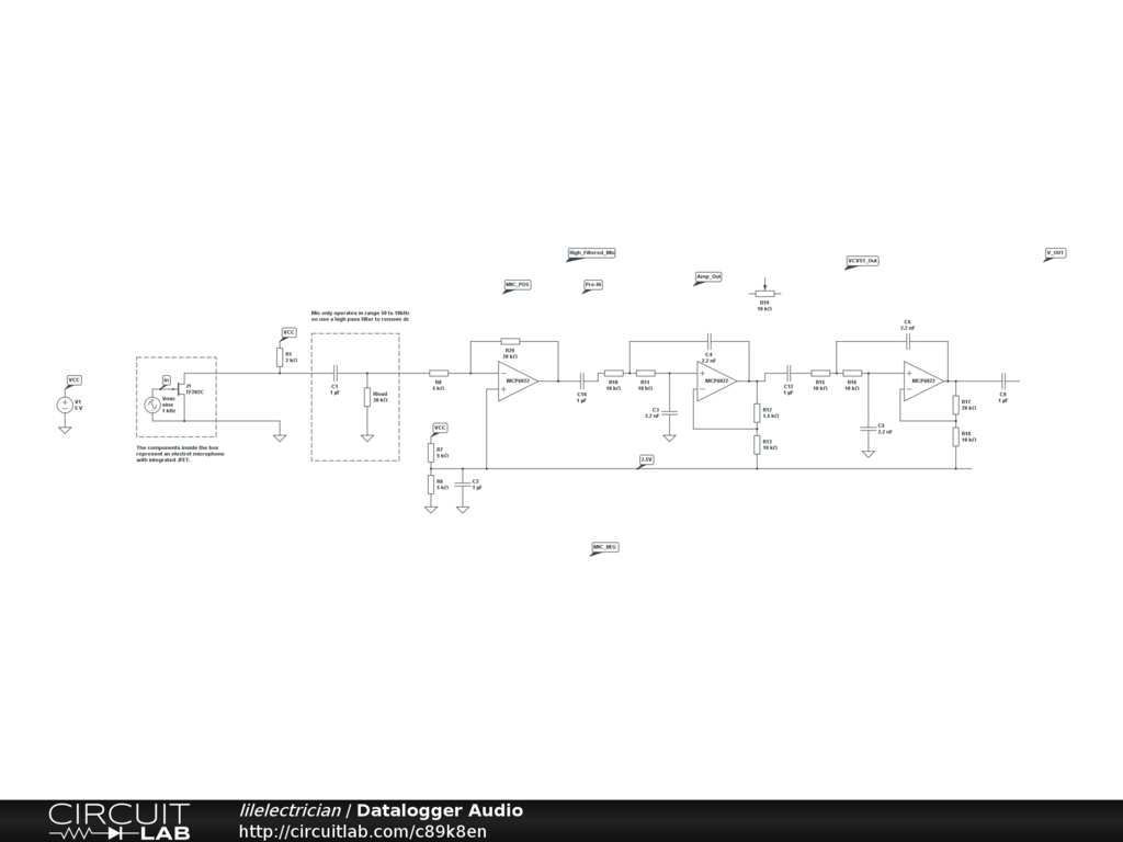 Starts with an electret mic which goes through a high pass filter, inverting op amp and a pair of low pass vcvs filters.