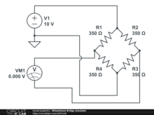 Voltage is applied to two parallel legs of equal resistance. Each leg contains two equal resistors. Voltage is measured across the two legs between the resistors. If both legs are equal then the voltage drop across VM1 will be 0Vdc. If one leg is different than the other the legs will have different voltage drops at the mid-point and create a difference of potential across VM1.