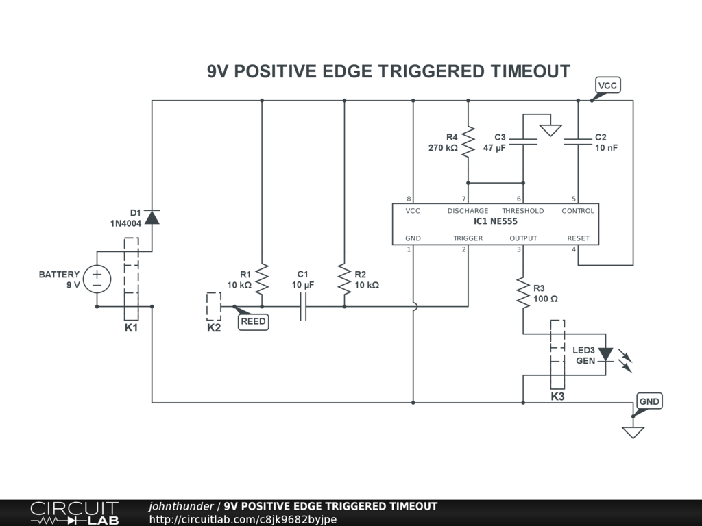 This circuit monitors the input at connector K2. On a falling edge (K2 connected to Ground), a timer is started via a 555 IC in monostable configuration. Once the timer lapse (timeout), the output on K3 goes to logic level 1, and the LED3 is lit. The signal on output 3 can be used in other circuits to incorporate the timeout functionality.