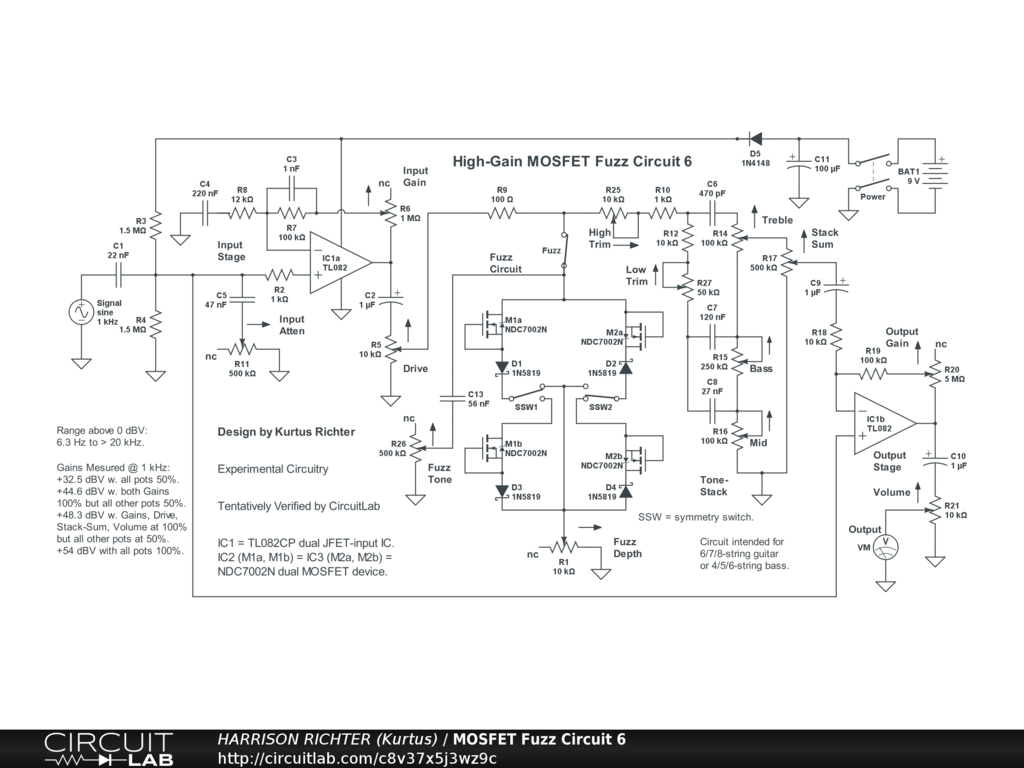 High-gain MOSFET fuzz circuit, design # 6. Uses one dual JFET-input op-amp for gain, and two dual enhancement-mode MOSFET ICs plus four Schottky diodes in a hard-clipping array for fuzz, with user selectable symmetry. There is also a modified 3-band Fender-style tone-stack. Controls Include: Input Attenuation, Input Gain, Drive, Fuzz enable switch, Fuzz Tone, Fuzz symmetry switches, Fuzz Depth, High Trim, Low Trim, Bass, Mid, Treble, Stack Sum, Output Gain, and Volume. Range above 0 dBV is from 6 Hz to > 26 kHz. Practical range is from 20 Hz to 20 kHz. Suitable for 6/7/8-string guitar of 4/5/6-string bass, with emphasis on highs when all controls are at 50%. Example gains are +22dBV (Vo/Vi = 12.2) @ 25Hz, +32.7dBV (Vo/Vi = 43.2) @ 100Hz, +32.5dBV (Vo/Vi = 42.2) @ 1kHz, +34.8dBV (Vo/Vi = 55) @ 10kHz through 20 kHz and above. Can be used for stomp-box or rack-mount projects. The battery can be replaced by a regulated single-polarity +9V DC supply providing >= 20 mA of current. And while simulator verified, treat the circuit as experimental. Breadboard test before committing to a soldered build.