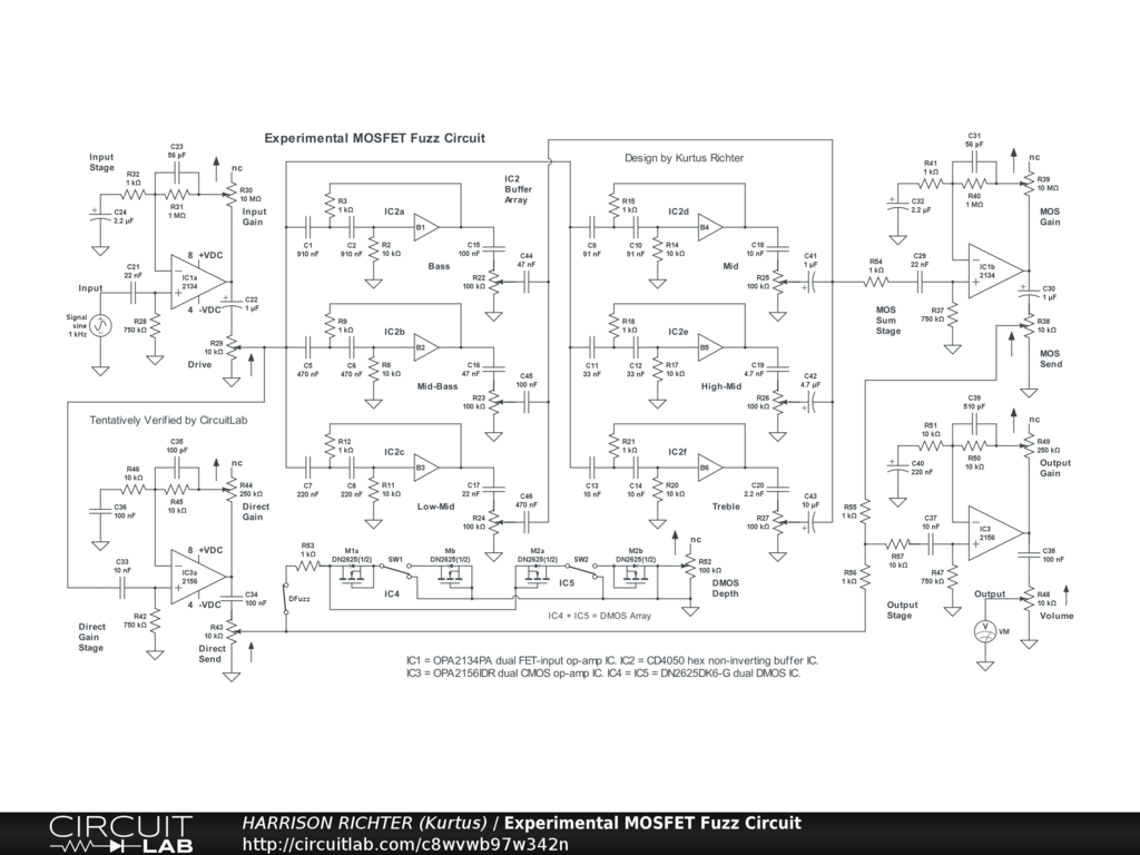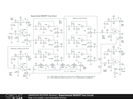 Experimental MOSFET fuzz circuit for electric guitar, features one dual FET-input op-amp IC, one CMOS op-amp IC, one hex non-inverting buffer IC that uses MOSFETs internally, and two dual DMOS transistor ICs to provide a complicated method for obtaining fuzz and distortion. Controls Include: Input Gain, Drive, Direct Gain, Direct Send, Bass, MId-Bass, Low-Mid, MId, High-Mid, Treble, MOS Gain, MOS Send, DMOS enable switch, DMOS symmetry switches, DMOS Depth, Output Gain, and Volume. In particular, one FET-input op-amp is used to send a clean input signal to the buffer array and to a Direct Gain Stage in parallel with the buffers. The buffers and Direct Gain Stage can both be overdriven; the buffers giving MOSFET fuzz and the Direct Gain Stage giving CMOS distortion. The signals from the buffers sum in the other clean FET-input op-amp, whose output is itself mixed with the Direct signal in the Output Stage, likewise able to be overdriven to provide even more CMOS distortion. The DMOS (depletion-mode MOSFET) transistors are wired to work like diodes and are used in a hard-clipping (shunt type) array from the Direct signal path to ground, but which can be switches ON or OFF. The buffers are setup as high-pass filters with different low cutoff frequencies. So, they all emphasize highs. But all of the op-amps emphasize lows. And because the filters cut gain significantly, the overall circuit emphasizes lows. Yet, the buffers are for overdriving, not for tone-control, and their differences in low corners is for voicing, not tone shaping. Consequently, using a tone-control of some kind at the input or output of this circuit is recommended. Power-supply not shown. Requires a dual-polarity DC supply providing +-9VDC or +-12VDC or +-15VDC at >= 100 mA of current. And while simulator verified, treat the circuit as experimental in nature. Thus, thoroughly breadboard test before committing to a soldered build. And house in a grounded metal enclosure.