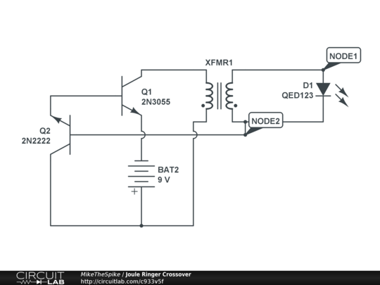 This is the LaserSaber Joule Ringer CrossOver circuit. I am not sure what the transformer resistances are for this circuit to work and I cannot find a 220V LED light, but I created it and used an LED instead.