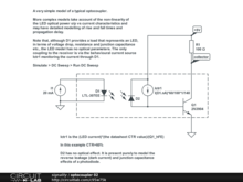 Note that, although D1 provides a load that represents in terms of voltage drop, resistance and junction capacitance etc., the LED model has no optical parameters. The only coupling to the receiver is via the behavioural current source Ictr1 monitoring the current through D1.