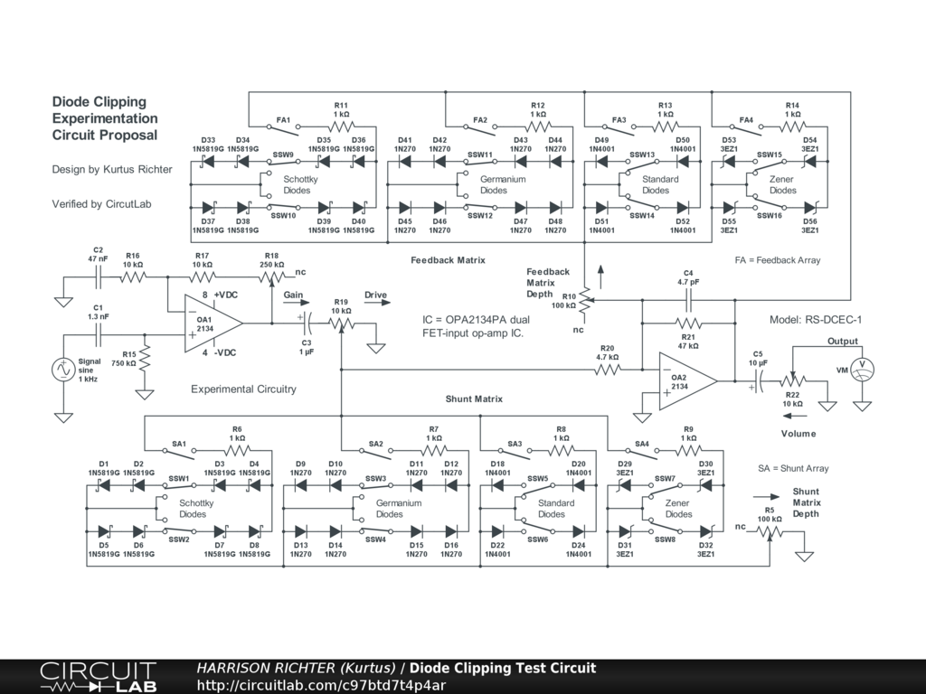 Circuit designed for making comparison tests of the sound of different diode types used for causing clipping of guitar signals to make a fuzz effect. Controls Include: Gain, Drive, Fuzz Switches, two Fuzz Depth controls, and Volume. There are two diode matrices; a Feedback Matrix and a Shunt Matrix. Each Matrix has four diode arrays with one enable switch and two symmetry switches. This allows for comparisons between eight arrays involving four different diode types; four in feedback loop (called a "hard-clipping" arrangement) and four in a shunt circuit (called a "hard-clipping" circuit, where the diodes are between the signal-path and ground). The diode types are also referred to as giving "hard" or "soft" fuzz. The diode types used here are; Schottky (soft), Germanium (soft), Standard Silicon (hard), and Zener (hard). Comparisons can thus be made between diodes in the same Matrix or those in the two different Matrices. With no fuzz enabled, the op-amps have a range between 49 Hz and 6.3 kHz, and a maximum gain of +24.7 dBV @ 250 Hz, with the controls at 50%. But with controls at 100%, maximum gain is +45.2 dBV @ 250 Hz, and the range extends from 22 Hz to > 20 kHz. Yet, the diodes do not greatly affect gain. The switch arrangement in the schematic indicates that for which clipping levels are very close across the board, so adjustment of the Volume control is minimized during comparison tests, and the enable switches allow for selection either of one array at a time or multiple arrays simultaneously. The symmetry switches set the harmonic content of the fuzz, and may have the most noticeable effect on sound. Note: Schottky arrays have the most effect on gain, but it amounts to no more than a 1.4 dBV cut. This circuit is designed as an experimentation project and could therefore remain as a breadboarded effort only. But if permanent soldering is desired, rack-mounting is recommended due to the number of switches, and to avoid bending over to make changes if floor-mounted. Power-supply not shown. Requires a regulated dual-polarity DC supply providing +-9VDC or +-12VDC or +-15VDC at >= 20 mA of current. Note: Higher supply voltage results in lower op-amp noise.
