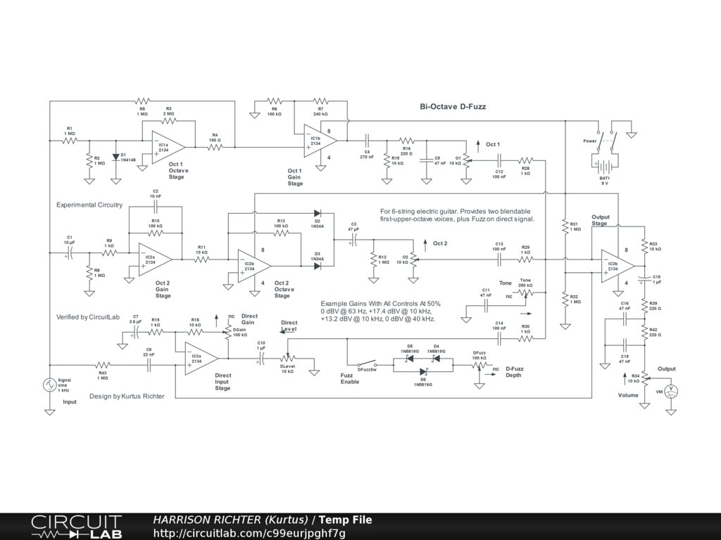 Two 1st upper octave voices plus fuzz on the direct signal. All three signals are mixable separately. The two octave voices are derived from different subcircuits, and the fuzz on the direct signal can be disabled. Controls Include: Oct 1 level, Oct 2 level, Direct Gain, Direct Level, Fuzz Enable switch, Fuzz Depth, Tone, and Volume. Range with all controls at 50% is from 40 Hz to 40 kHz. Maximum gain = +17.4 dBV @ 2.5 kHz with all controls at 50%, double that minimum with all controls at 100%. Recommended only for 6-string electric guitar. Suitable for stomp-box applications, but the battery can be replaced by a regulated single-polarity DC supply providing +9VDC at >= 40 mA of current. And while simulator verified, treat the circuit as experimental. Breadboard test before soldering.
