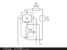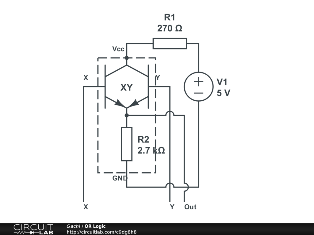 This is a basic boolean OR logic gate made with transistors, it takes X and Y as input, if any of the two inputs are HIGH the output will be HIGH.