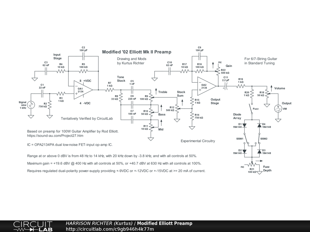 Guitar preamp circuit based on the op-amp preamp for the 100W Guitar Amplifier Mk II by Rod Elliott. See the original circuit here. https://sound-au.com/project27.htm Modifications are; changes in part-values to increase gain and to obtain a preferred frequency response curve, along with changes to the diode array. Controls Include: Bass, Mid, Treble, Stack Sum, Gain, Fuzz enable switch, Fuzz symmetry switches (two, with 2 settings each), Fuzz Depth, and Volume. Range at or above 0 dBV is from 48 Hz to 14 kHz. Ideal for 6/7-string guitar in standard tuning. [Not suitable for 8-string guitar or bass.] Maximum gain = +19.6 dBV (Vo/Vi = 9.6) @ 400 Hz with all controls at 50%, or +40.7 dBV (Vo/Vi = 108) @ 630 Hz with all controls at 100%. Power-supply not shown. Requires a regulated dual-polarity supply providing +-9VDC or +-12VDC or +-15VDC at >= 20 mA of current. And while the circuit is based on a proven design, plus being simulator verified, treat it as experimental in nature. Breadboard test it before committing to a soldered build.