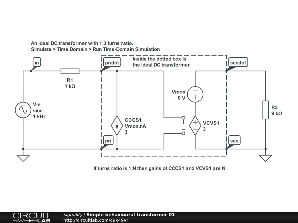 Edited 120629. Corrected error in describing the ratio for CCCS1: was incorrectly given as 1/N. Corrected to N. Ratio changed from 1:2 to 1:3 to clarify waveform plots. Added 1k source resistor and 1k*N^2 load resistor to illustrate impedance transformation action more clearly.