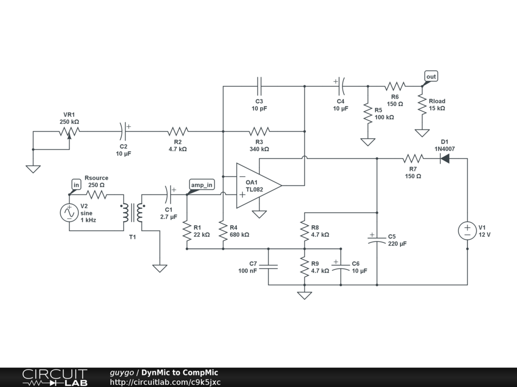 This preamp adapts a dynamic microphone to a computer Mic Input. It provides transformer isolation to the low-impedance microphone line (so you can run long lines and still be low-noise) and a 25-50dB Gain Adjust pot. It is intended to run off of a 12 to 28 VDC single-ended supply.