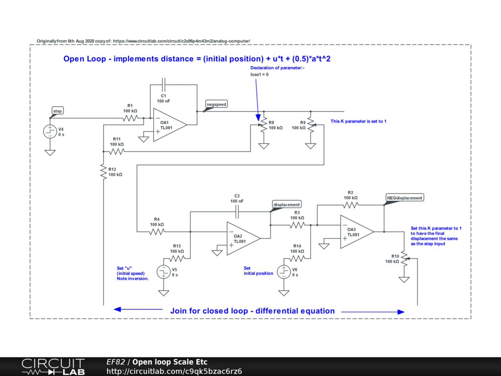 Mass 1kg = 100nF at acceleration integrator, OA1 AND pot R9, 1/K = 1 (NB reciprocal)