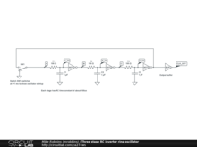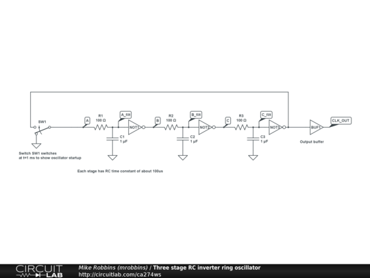 Three inverter stages in a ring, with RC for delay, create an oscillator.