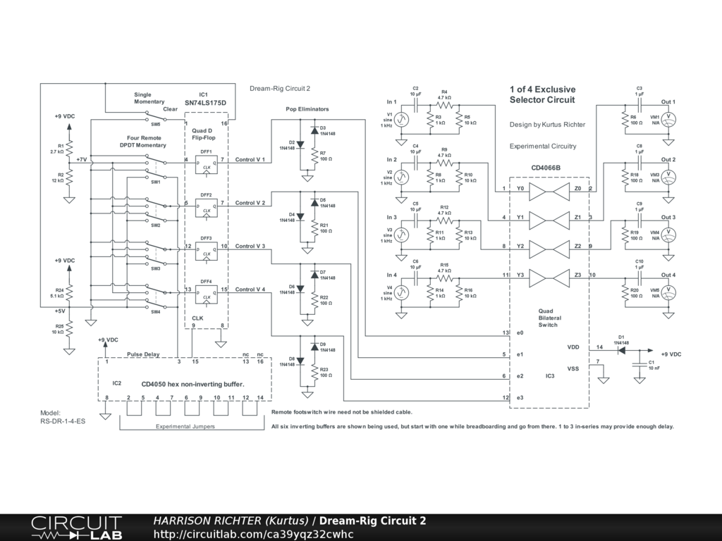 Circuit 2 in the Dream-Rig Project. 1-of-4 Exclusive Selector channel-switching circuit. Allows clean-switch selection between 4 audio-signal channels connected using ordinary 1/4" patch-cords or guitar-cables. Only one channel will be enabled at a time, depending on the press of a remote momentary footswitch; one for each channel, plus one extra footswitch for a Clear function that disables all channels, and at which all channels will remain disabled until one of the Channel Switches is pressed. Example Setup: Channel 1 with patch-cord for clean signal, Channel 2 with a clean boost, Channel 3 with a fuzz pedal set for same or more gain than Channel 2, and Channel 4 with a fuzz pedal set for more gain than Channel 3. Requires a dual-polarity +-9VDC power-supply. Do not use any other supply voltage. Experimental circuitry. Breadboard test before committing to a soldered build.