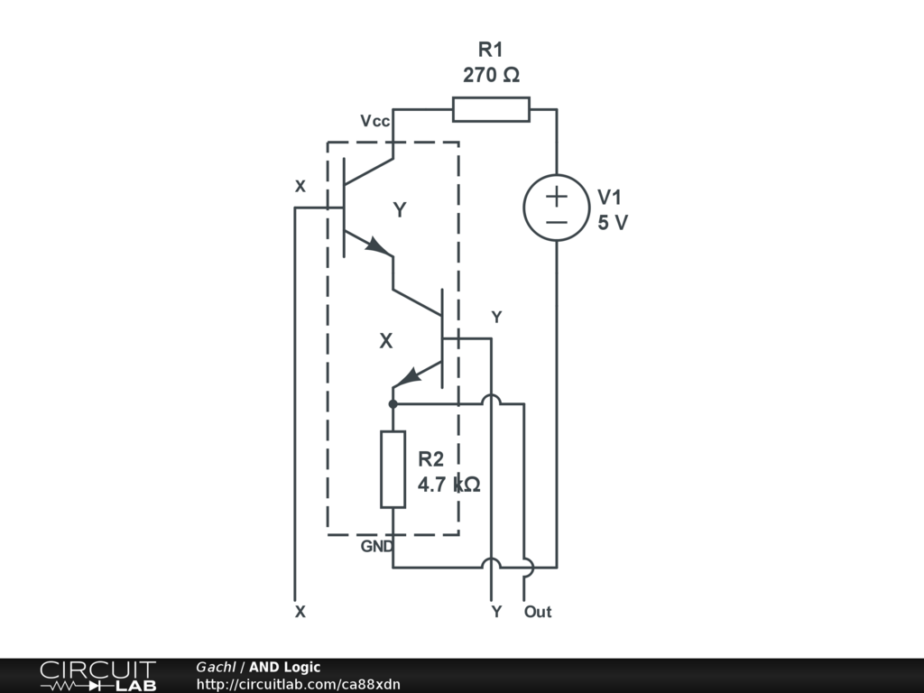 This is a basic boolean AND logic gate made with transistors, it takes X and Y as input, if both inputs are HIGH the output will be HIGH.