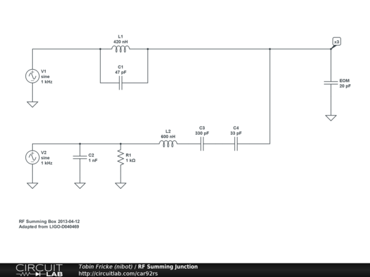 This circuit provides an RF summing junction to allow both a 35 Hz oscillator and a 0-10 MHz control signal to be summed into an electro-optic modulator (Newport model 4004).