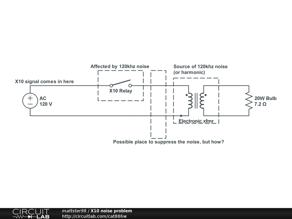 Simple diagram to show my X10 noise problem, the source, the affected part, and where it might be suppressed.
