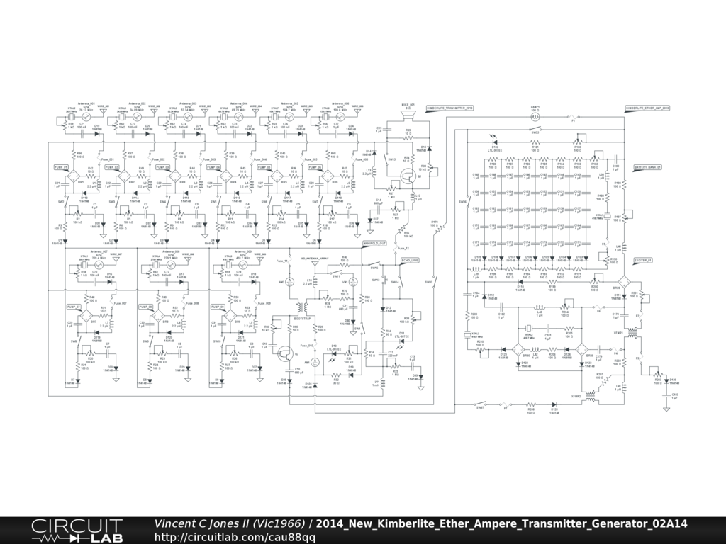 An array of wire antennae provide signal current. A set of transformers boosts the voltage, and the signal goes out through a 9-D antenna set. One of the main ideas here is that; although the design work is as yet incomplete [partly for the protection of intellectual property rights], as one can see a confounding plethora of diodes throughout the circuit, it is evident that I don't really believe in "DC current" at all---or else the circuit could not function, ever. So-called DC current is merely AC current with a >100% bias. [i.e. Because the so-called DC current has a changing rate, thus it reacts as though it were an AC current with a <100% bias.] The 9-D antenna set is expected to produce instantaneous radio transmissions, even through solid matter.