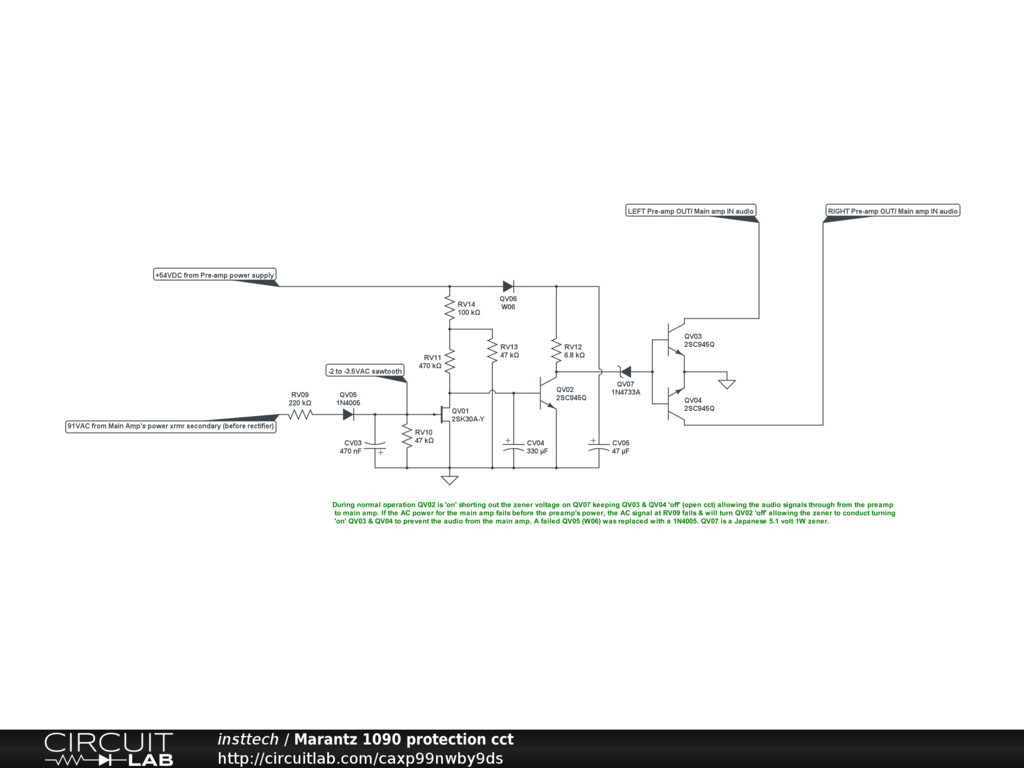 I had been working on a friend's Marantz 1090 stereo console amp. He hadn't used it for quite some time & asked me to look at. I put some music through it & found that the volume was very low for a 45 watt x 2 amp & when I cranked it up it was full of distortion banging in my speakers. Then I put a 1KHz sine wave on it, scoped the pre-amp outputs & the peaks on 1 end were flattened. I had <50 mv AC going to the main amp which is kind of low for a pre-amp output. I did have issues with the Hi Filter switch being erratic as all signal leave the pre-amp through this. The switch was replaced which took care of that secondary problem but now back to the distortion. I had the same problem despite changing the FET & 3 transistors & it turned out the the diode to the FET's gate was not quite a diode anymore & was keeping the FET gate slightly positive keeping the protection circuit on. A new diode fixed everything here! Marantz used this scheme to ground out the pre-amp signals to the main amp if the main amp's power supplies were weak or lost. The pre-amp uses a transformer secondary, which is rectified & then regulated to +38 VDC to power the phono pre-amp as well as the 'main' pre-amp & tone components. It supplies +54 VDC (pre-regulation) to power this protection circuit on PCB PV00 mounted behind the rear panel with all of the RCA jacks on it. The main amp power is bi-polar (~ +/- 45 VDC) & a wire from 1 end of the center tapped secondary for this supply provides ~ 90 VAC peak to peak ( 33 VAC rms) to RV09 (220K) to keep this circuit 'happy'. When I ordered replacement semiconductors for this, I bread boarded the circuit to see how it worked & how it failed. I found that when the AC signal fell <60 volts p-p QV02 turned off allowing current limited voltage via the zener QV07 to turn QV03 & QV04 on which allowed continuity between both collectors to ground. In the faulted amplifier's case those 2 transistors had a very low impedance to ground (not a dead short) which allowed a very small amount (<50 mv) of audio but with distorted peaks. Diodes listed in this schematic are Japanese W06B & the zener is WZ-052. The failed diode was replaced with a 1N4005 & if needed the zener could be replaced with a 5.1 volt/ 1 W North American version. The FET & other transistors were replaced with the same component numbers through Ebay as my 3 North American suppliers listed them as 'obsolete' & therefore unavailable. NOTE: if you have the almost 30 page service manual, be aware that there are a few connector mis-labellings & wires landed in wrong places on the main amplifier schematic.