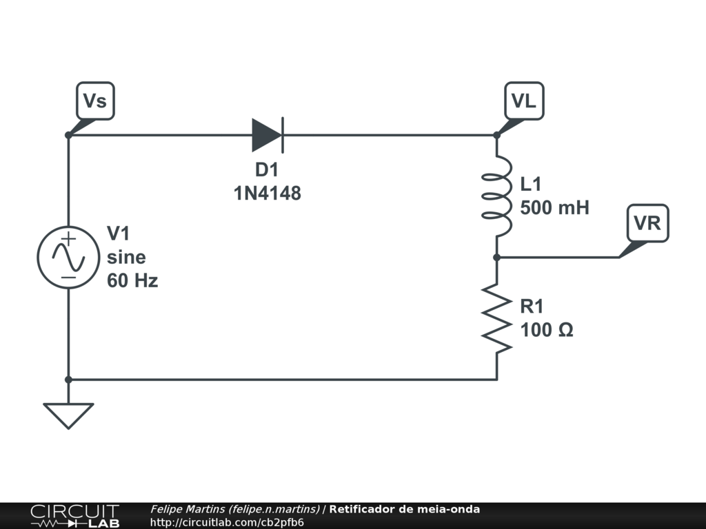 Simular o circuito retificador mostrado. Variar os valores de carga e de indutância e observar a variação das formas de onda de VL e VR.