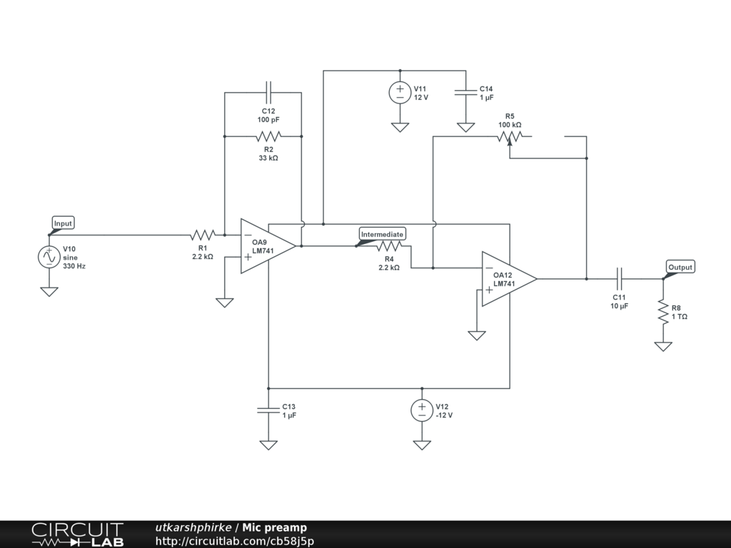 This is a microphone pre-amplifier circuit with gain adjustable by R5 pot and signal attenuation after 2 KHz.