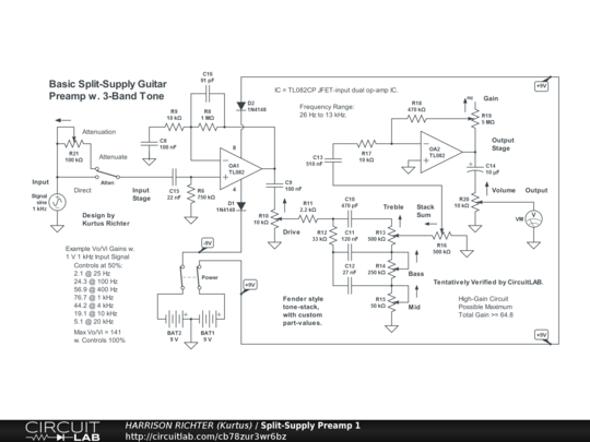 High-gain guitar preamp with 3-band Fender-style tone-stack. An overdrive circuit. Controls Include: Input Attenuation enable switch (Attenuate or Direct), Attenuation control, Drive control, Bass, Mid, Treble, Stack-Sum, Gain, and Volume. No fuzz. However, the Input Stage can be overdriven with sufficient input signal level, and the Output Stages can be overdriven by sufficient clockwise settings of the Drive and Stack Sum controls. Both will provide JFET distortion when overdriven. Maximum total gain with controls at 50% is 37.7 dBV (Vo/Vi = 76.7) @ 1 kHz, or 43 dBV (Vo/Vi = 141) with controls at 100%. Frequency Range: 25 Hz to > 20 kHz, with emphasis between 630 Hz to 2.5 kHz. Suitable for 6/7/8-string guitar or 4/5/6-string bass.