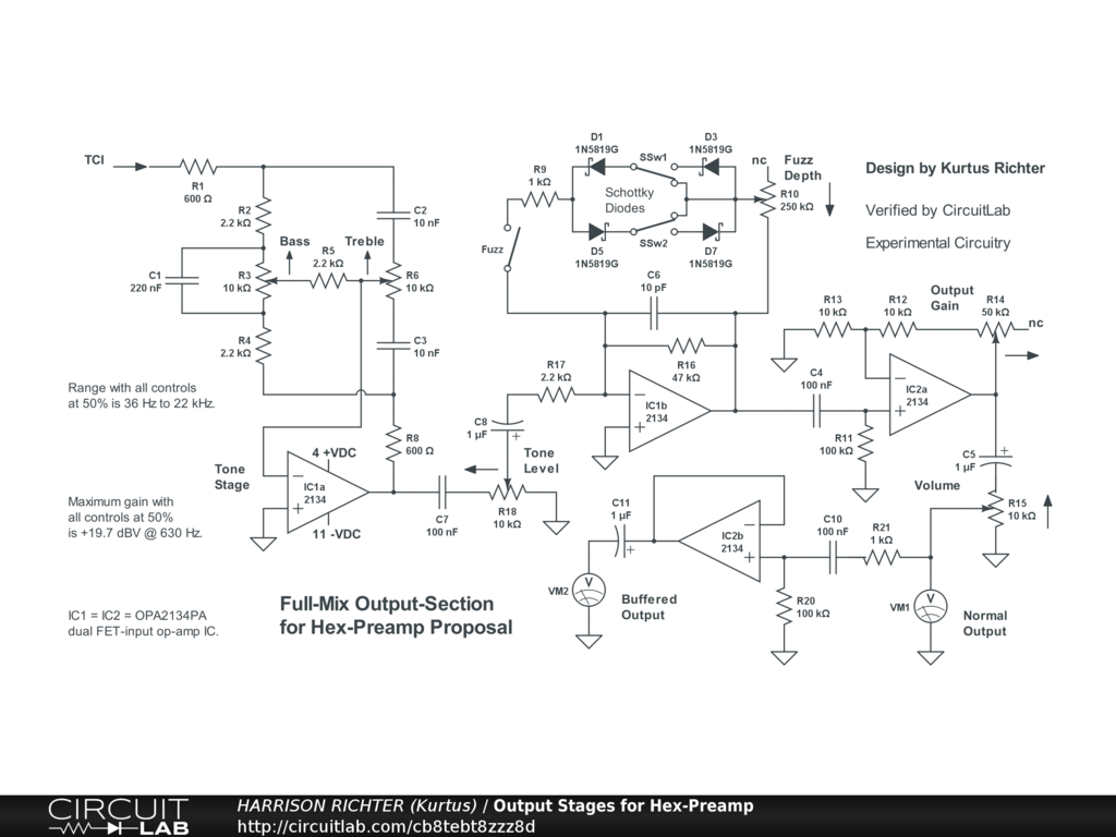 This is the Output Section for the Hex-Preamp design given in this website in three parts: The Input Section, the Mixer Section, and the Output Section, plus a power-supply circuit for the entire project. This Section accepts the full-mix signal from the Mixer Section, routes it through a 2-band James-style tone-control circuit, includes a Fuzz option involving Schottky diodes in a feedback-type (soft-clipping) array that can be switched on or off, an output gain stage with a normal output, plus an extra buffered output. This Section's output is intended to provide a fully mixed Hex-Preamp signal to effects, digital processors, power-amps, high-impedance PA inputs, or recording gear. Power-supply not shown. Requires a regulated dual-polarity +-15 VDC power-supply providing up to 20 mA of current. However, a purpose-designed power-supply circuit for the entire Hex-Preamp project is shown at this website. Experimental Circuitry! Fully breadboard test before committing to a soldered build. See complete Hex-Amp System under "Amplifiers" heading at https://kurtusrichtersblog.com .