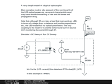 Note that, although D1 provides a load that represents an LED, in terms of voltage drop, resistance and junction capacitance etc., the LED model has no optical parameters. The only coupling to the receiver is via the behavioural current source Ictr1 monitoring the current through D1.