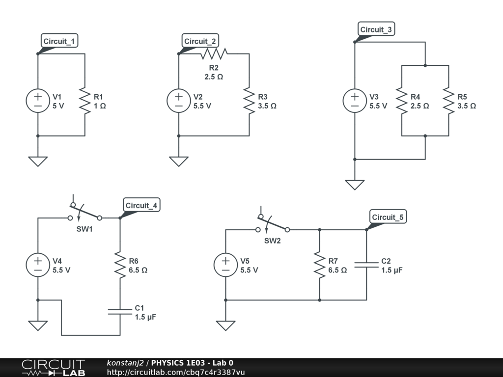 Circuits 1-5 for PHYSICS 1E03's Lab 0