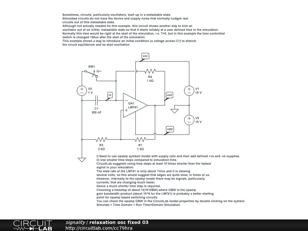 Sometimes you have to kick an oscillator out of an initial, metastable state so that it starts reliably at a user defined time in the simulation. This shows a way to do that.