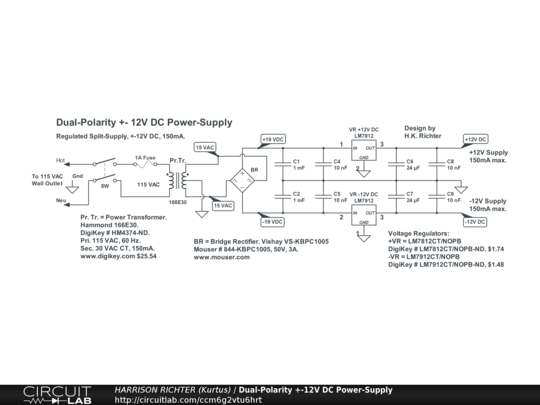 Regulated dual-polarity +-12V DC power-supply. 150mA available current. For preamp circuits using op-amps. Sufficient for supplying up to 15 op-amps.