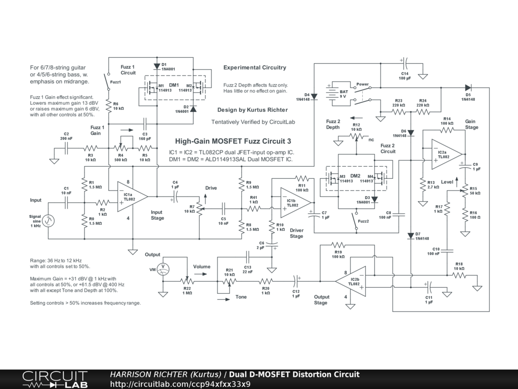 High-gain MOSFET fuzz circuit 3. Uses two dual JFET-input op-amp ICs for gain, and two dual depletion-mode MOSFET devices for fuzz. The op-amps can also be overdriven to add solid-state JFET distortion to the fuzz. Note that the two MOSFET devices are configured separately; one with two standard silicon diodes in a symmetric hard-clipping array, but the other with one standard diode in an asymmetric hart-clipping array. Controls Include: Fuzz 1 enable switch, Fuzz 1 Gain, Drive, Fuzz 2 enable switch, Fuzz 2 Depth, Level, Tone, and Volume. Range above 0 dBV is from 36 Hz to 12 kHz, making the circuit suitable for 6/7/8-string guitar or 4/5/6-string bass, with emphasis on the midrange. Maximum gain = +32.9 dBV (Vo/Vi = 44.2) @ 250 Hz with all controls at 50%, or +61.5 dBV (Vo/Vi = 1188) with all controls at 100% except for Tone and Fuzz 2 Depth, which remain 50% each. The Fuzz 2 Depth has little effect on gain, while the Fuzz 1 Gain control has a significant effect on gain and also on range. The Tone control has negligible effect when set > 50% but significant effect when set < 50%. The circuit can be for a stomp-box or rack-mount application. Battery can be replaced by a regulated single-polarity +9V DC power-supply providing >= 30 mA of current. And while the circuit is simulator verified, consider it experimental. Breadboard test before committing to soldered build.