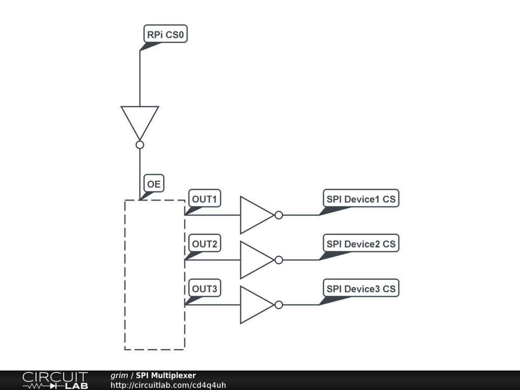 To get around this, I used logic inverters and a shift register (the box outline) as described in the diagram. This requires that I shift a value into the register indicating which device I want just before I conduct SPI conversations. This technically introduces some delay in my communications, but it is not significant for my purposes, as I'm only running around 1 Mhz.